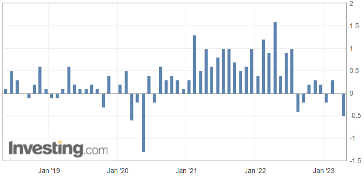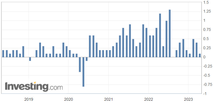 코로나19 때는 경기침체를 겪으며 전월 대비 CPI가 마이너스(-)였다가, 이후 연준의 확대 통화정책에 힘입어 플러스(+)로 돌아섰다. 연준은 2022년 3월부터 금리를 인상하기 시작했고 그 효과가 서서히 나타나는 중이다. 아직 CPI가 하락하는 건 아니고, 상승률이 하락하는 것이라는 점은 알아둬야 한다.