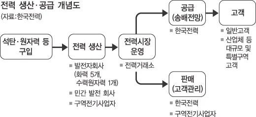 일단 전력 사업의 구조를 알아야 한다. 한전의 6개 발전자회사와 민간발전회사, 구역전기사업자가 전력을 생산한 뒤 전력거래소로 보내면 한전이 구매해 송배전망으로 고객에게 공급하는 구조. 송전망을 통해 전기를 보낸 뒤 배전망을 통해 최종 소비처에 나눈다. 이 공급 과정을 한전이 독점하고 있다. 아래는 경향신문의 기사에서 따온 개념도.