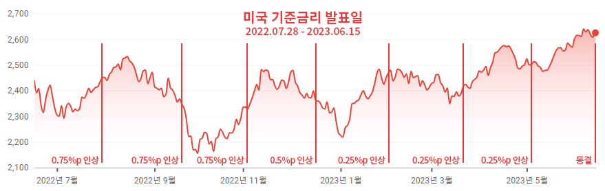 미 연준이 6월 FOMC 회의에서 기준금리를 5.00~5.25%로 동결하며 금리 인상을 일단 멈췄다. FOMC 정기회의는 1년에 총 8번으로, 대략 한 달 반에 한 번씩 열린다. 2022년 3월부터 금리 인상을 시작해 15개월 간 10차례 올린 후 첫 동결이다. 연준의 긴축 기조가 완화될 거라는 예측은 전부터 나왔는데 이제야. 미국의 금리 인상 과정과 국내 증시를 돌아보며 인사이트를 얻자.
