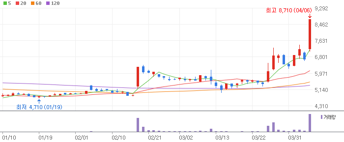 신고가를 경신한 점은 좋다. 다만 오후가 되어 상한가에 도달했다는 점, 그리고 평균 대비 거래량이 크게 증가했다는 점에서는 하락을 점칠 수 있다. 더욱이 시간외 단일가에서는 -4.71% 하락해 8,300원에 마감했다. 아무래도 시가는 전일 양봉의 중단 또는 하단에서 시작할 듯. 하단에서 시작하면 바로 매수, 중단에서 시작하면 호가창을 보며 잠시 기다린 뒤 매수하는 게 어떨까 싶다. 대신 초단기적 관점의 매도가 필요하다.
